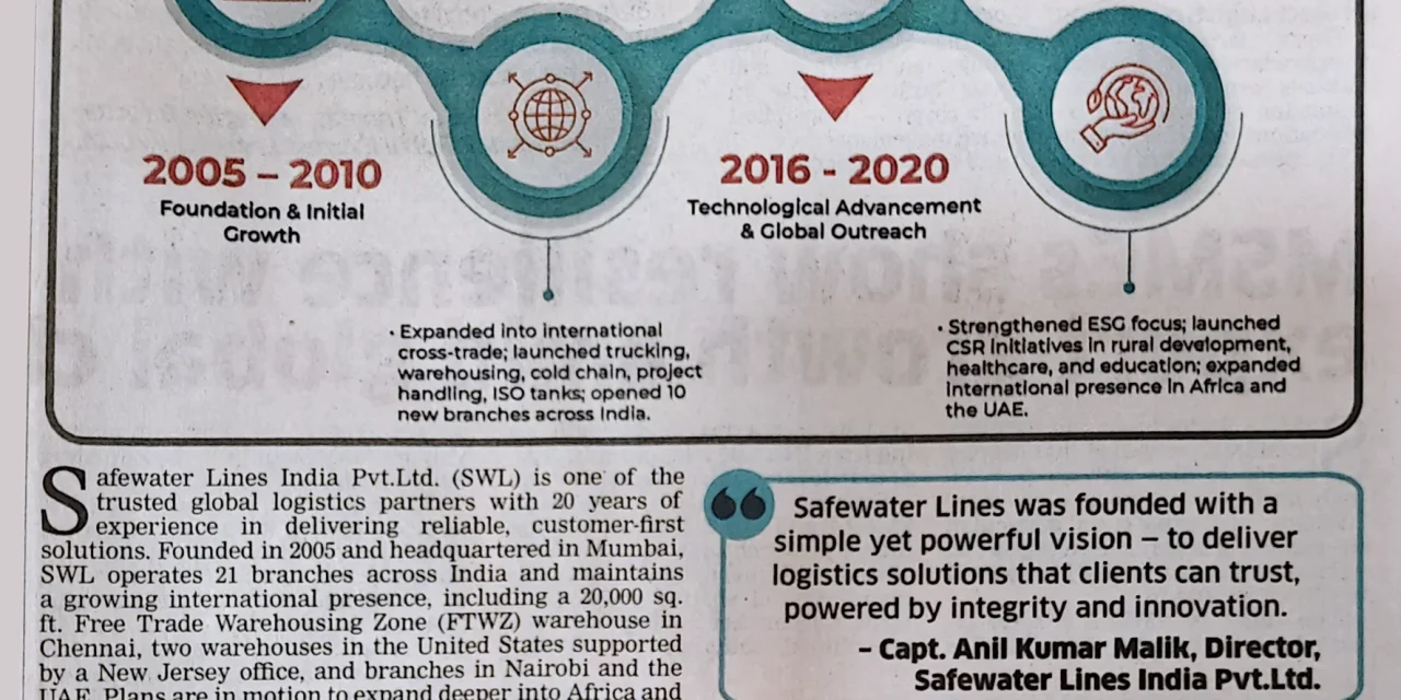 Safewater Lines India Pvt. Ltd. (SWL) proudly marks 20 years of building trust, enabling trade, and connecting India to global markets. This milestone was recently spotlighted in The Economic Times, recognizing SWL’s journey, values, and growing role in global logistics Founded in 2005 with a clear vision—to deliver logistics solutions clients can trust—SWL has evolved into a...